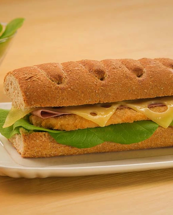 Imbottire ogni panino con qualche foglia di insalata, la cotoletta, una fetta prosciutto cotto e le fette naturali Leerdammer special toast.
